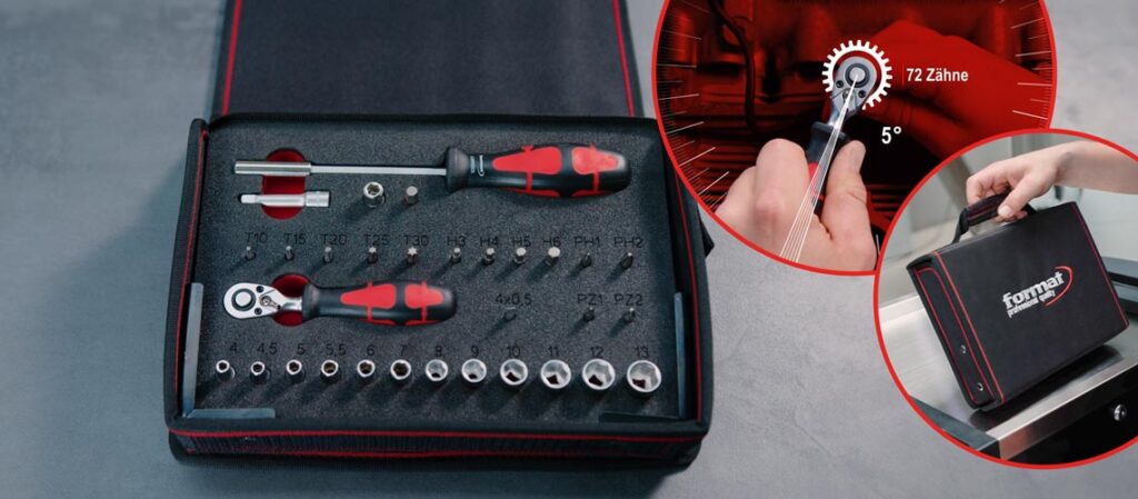 Longitud total 9 cm, ángulo de giro hacia atrás especialmente pequeño: la carraca de palanca FORMAT es ideal para trabajos de atornillado estrechos. Forma parte del juego de 31 piezas con herramientas de acero al cromo vanadio, perfectamente organizadas en el módulo de espuma. Un auténtico héroe del mes. El juego es perfectamente transportable gracias a la robusta carpeta de nylon. Especialmente práctico para los profesionales que también trabajan en movimiento.