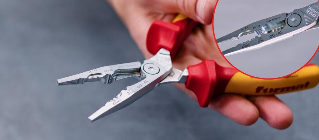 Los alicates para instalaciones eléctricas FORMAT cortan cables de cobre y aluminio con gran facilidad y precisión. Los filos de corte son cortantes, es decir, no hacen tope entre sí, sino que funcionan como los filos de corte de unas tijeras. Ventaja: los extremos de los cables no se aplastan y, por tanto, se procesan de forma mucho más limpia.