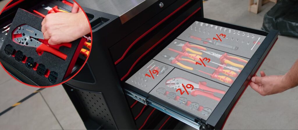 Cada profesional utiliza herramientas diferentes. Con los módulos de herramientas FORMAT, podrá personalizar la configuración de su carro de taller. Montaje preciso y tan sencillo como un sistema modular. Nuestros insertos de espuma bicolor sujetan perfectamente las herramientas almacenadas. El diseño de alto contraste en negro y rojo hace que las herramientas que faltan sean evidentes.